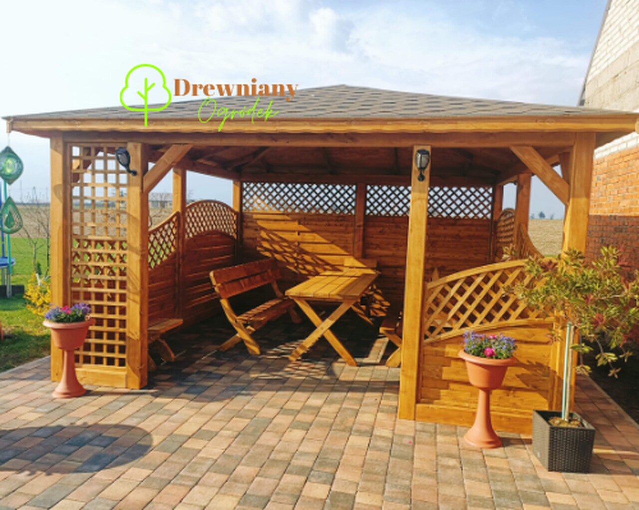 Piękna altana z lekka zabudową panelową 2 ścian. Drewniane panele osłaniają od wiatru, słońca dając komfort wypoczynku. Przód altany efektownie wykończony kratką, z jednej strony. Jedna ściana zabudowa pełna z kratką w górnej części.